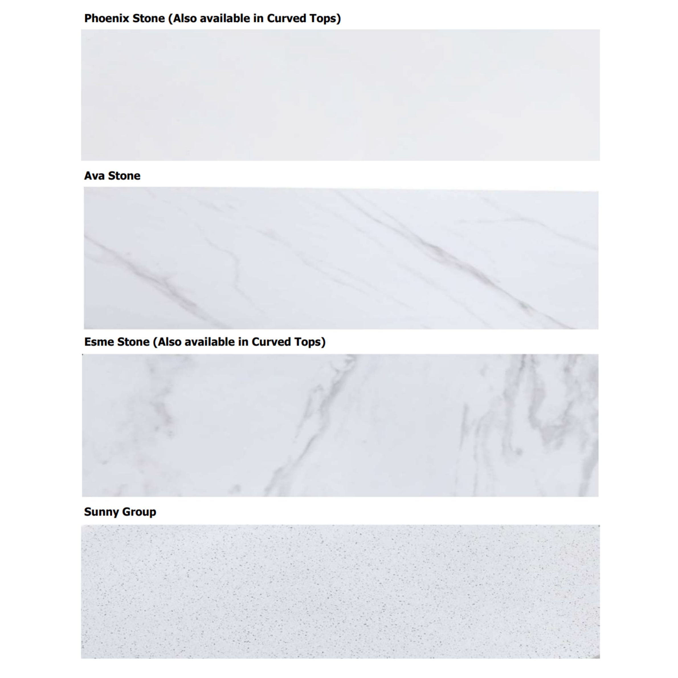 Top options: Esme Flat stone, Ava Flat stone, Sunny Flat stone, Phoenix Flat stone / Gloss white Ceramic Top / Stone & undermount basin