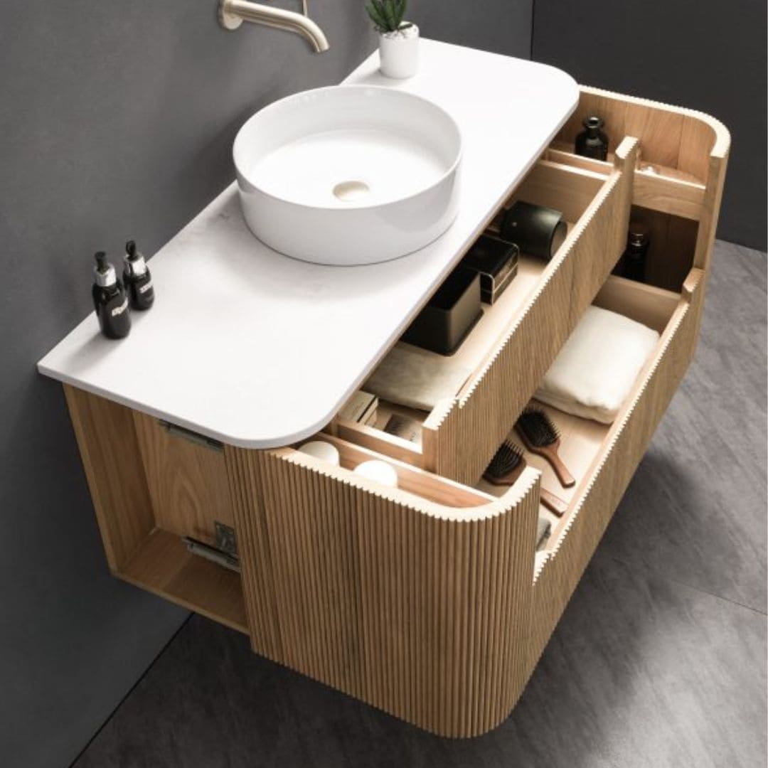 Oakmere 1200mm Golden Oak Wall Hung Fluted Vanity with side drawers